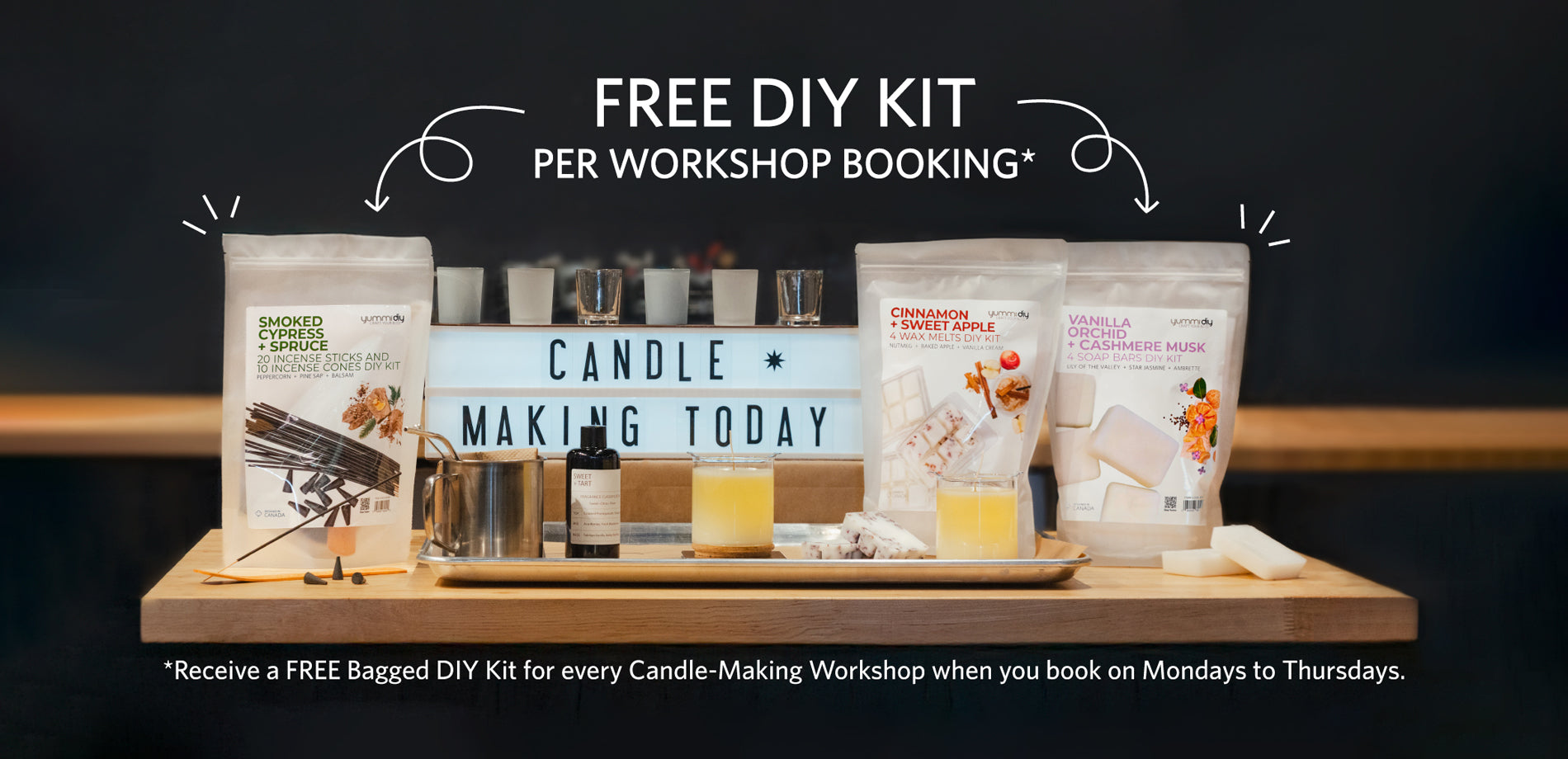 Book a weekday workshop and get a FREE Yummi DIY Bagged Kit to take home—continue your candle-making adventure at your own pace. Ideal for a cozy solo evening, couples’ night in, or creative fun with friends and family!