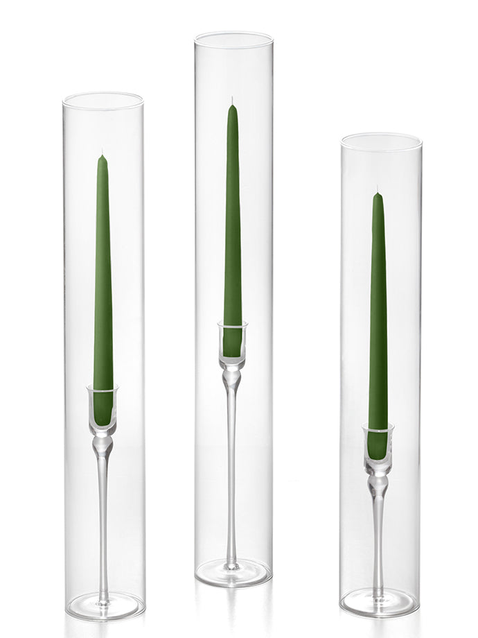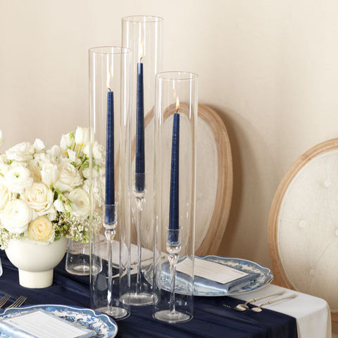 This set includes 12 hand-crafted taper candles designed to fit perfectly within the Aura's tall chimney holders. With varying heights, the candles create a dynamic, cascading display that draws the eye and enhances the atmosphere with warm, inviting light. Whether arranged symmetrically or in a more spontaneous layout, the staggered heights of the candles bring depth and interest to your centerpiece, turning any table into a stunning focal point.