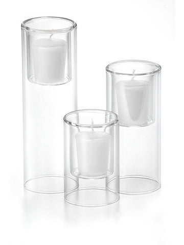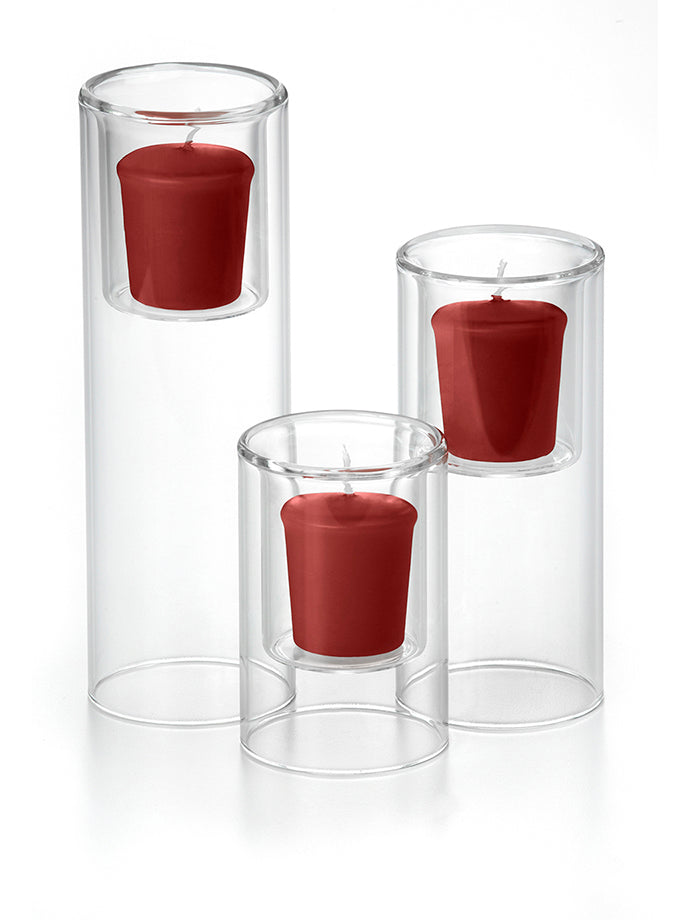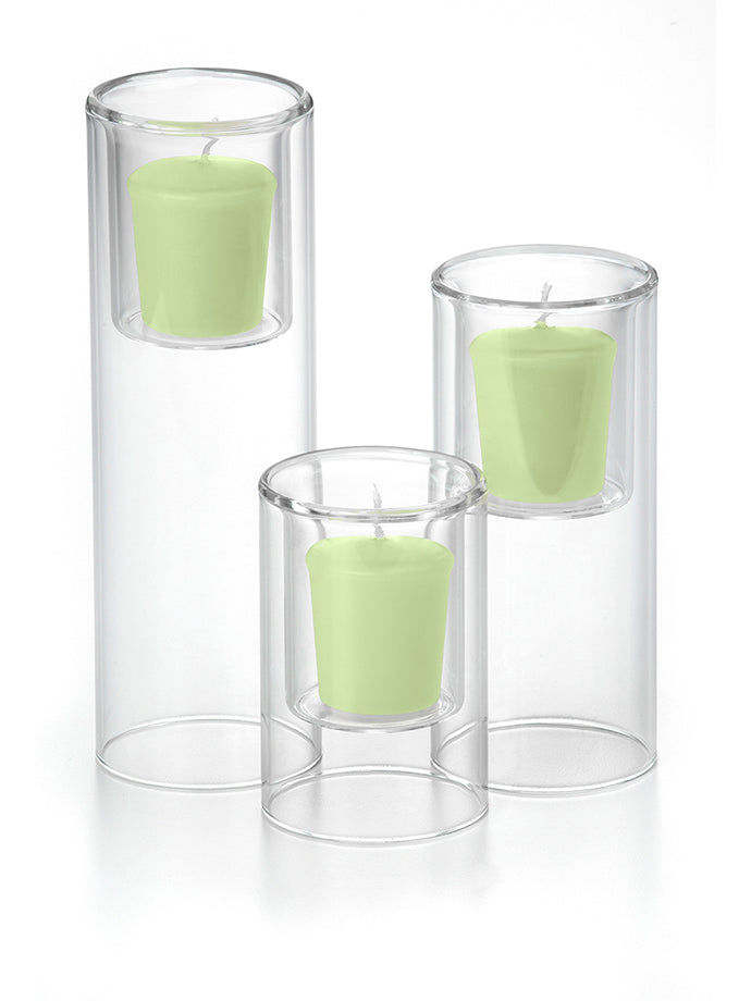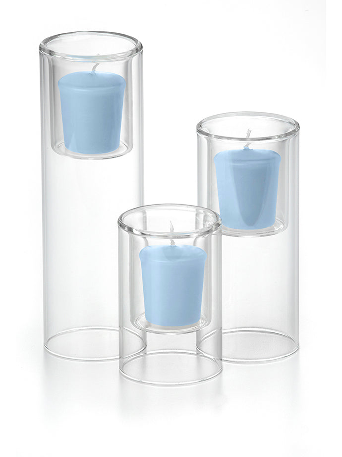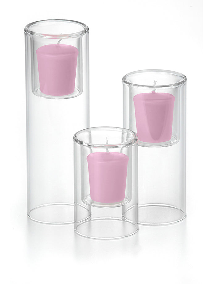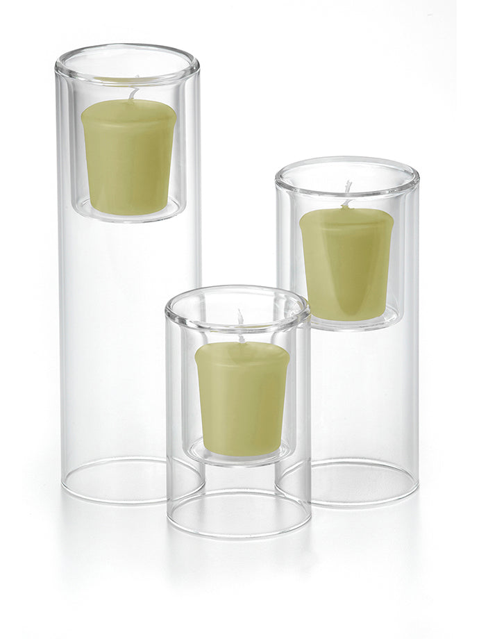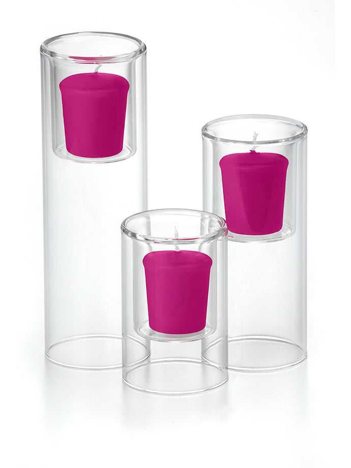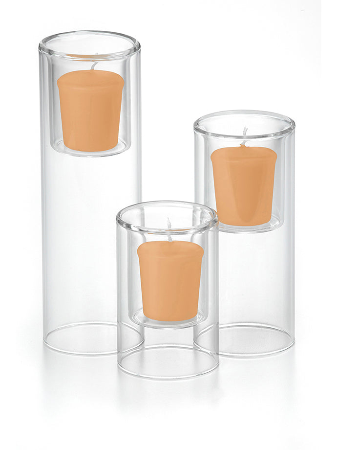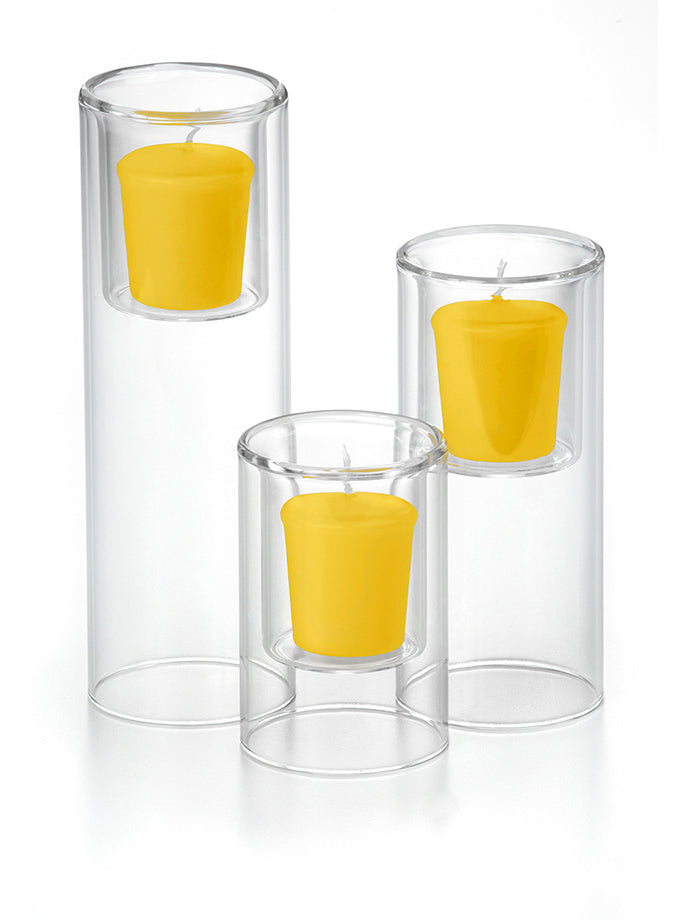 When planning a wedding with a budget in mind or decorating your home by creating centerpieces filled with beautiful votive candles will help set a wonderful mood and feel, while saving money. The Yummi 15 Hour Votive Candles and Ethereal Cylinders set of 36 Ethereal Cylinders and 36 votive candles, selected from our colour chart of 45 colours, will fit with the style and colour scheme of your home, wedding or special event. Looking for a bigger statement and need a longer burn time in a votive candle? This is the appropriate set with larger votive candle holders and candles designed to burn 15 hours versus the traditional 8-10 hours.