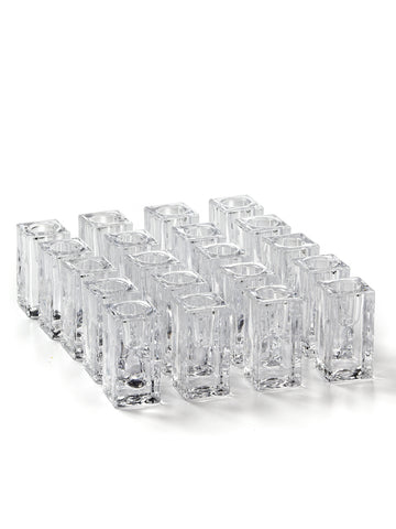 To complement the candles, we've included 20 clear glass square block holders that effortlessly blend simplicity with modern aesthetics. These holders are carefully designed to securely hold each candle in place, ensuring stability while allowing the soft glow to shine through, creating a mesmerizing ambiance that sets the perfect mood.