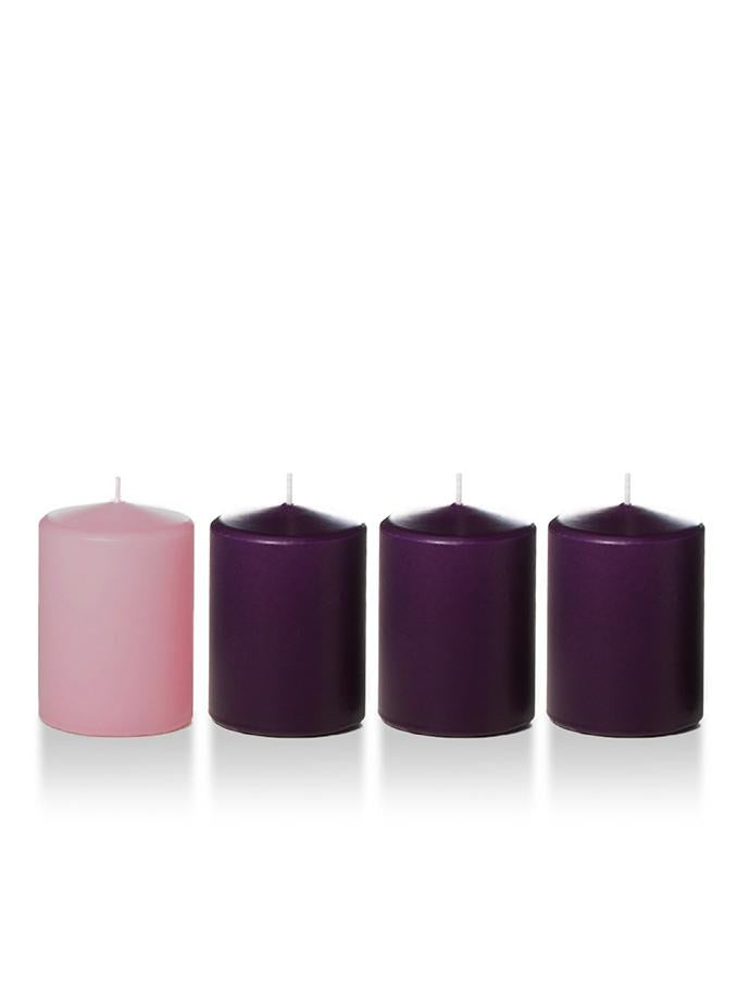 Our unscented wholesale advent pillar candles (12/case) are high quality and the best wholesale prices. Our advent pillar candles are handcrafted and hand over-dipped in a colorful palette of purple and pink. The outer core of this pillar is made of an extremely hard-shell wax crafted with the highest quality paraffin wax and all cotton wick that prevents the candle from dripping. Keep wick trimmed to 1/4". Keep away from drafts. Burns up to 40hrs.