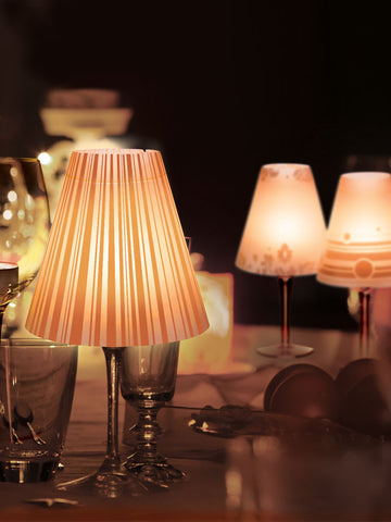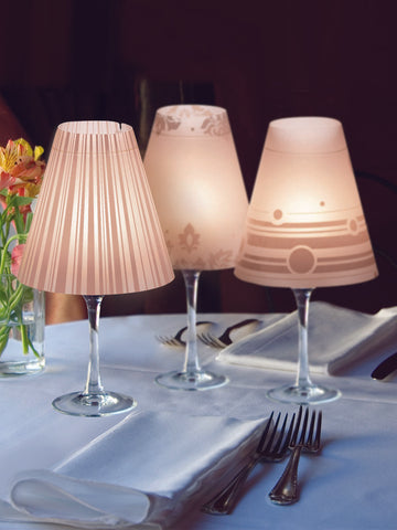 Featuring the White Luminaria Shade made with fire retardant paper - place overtop glass wine glass for a unique decorating concept for wedding centerpieces. For best presentation, we recommend using Luminaria shades with a standard size wine glass size (we suggest 8"ht x 2.5"opening).